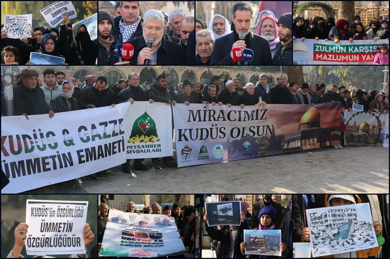 Kudüs Haftası programları kapsamında Şanlıurfa’nın Eyyübiye ilçesinde bulunan Balıklıgöl platosunda Cuma namazı çıkışında “Miracımız Kudüs olsun” temasıyla kitlesel basın açıklaması programı gerçekleştirildi.