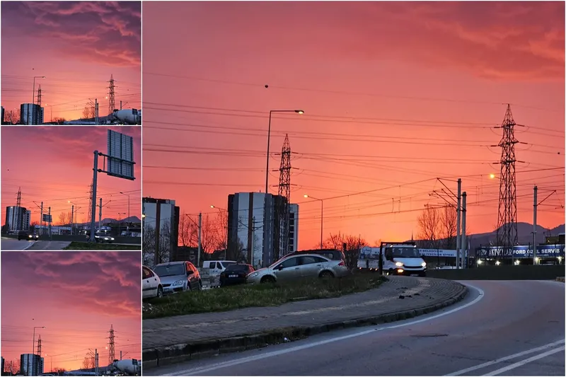 Ulaşımın başladığı saatlerde kaydedilen görüntüde, bulutların arasından süzülen ilk ışıklar; binalar, yol tabelaları ve elektrik hatlarıyla birlikte siluet halinde yansıdı.