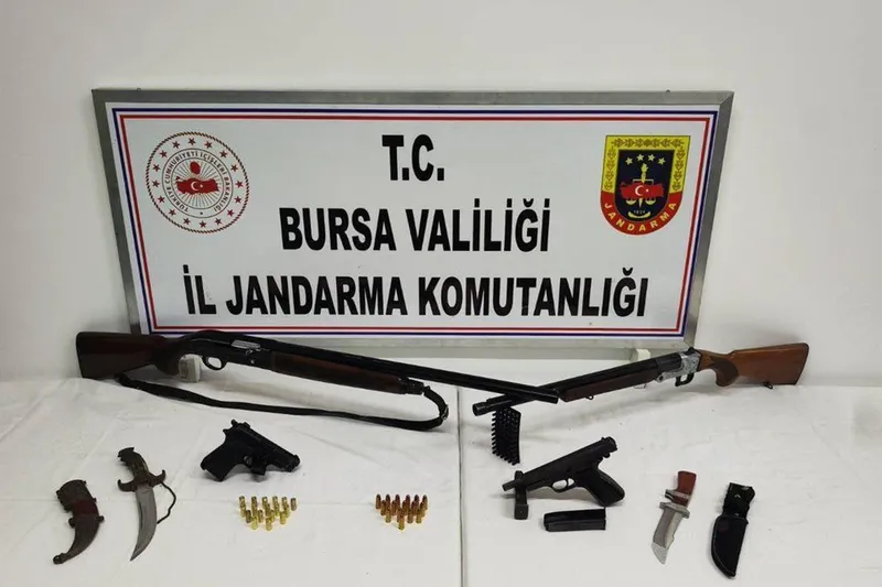 Bursa İl Jandarma ekipleri, alınan arama kararı doğrultusunda şüpheli şahıslara ait ikamette operasyon gerçekleştirildi. Yapılan aramalarda; 2 adet ruhsatsız tabanca, 2 adet ruhsatsız av tüfeği, 2 adet hançer, 33 adet 9 mm tabanca fişeği, 3 adet tabanca şarjörü ile bir adet cep telefonu ele geçirildi.