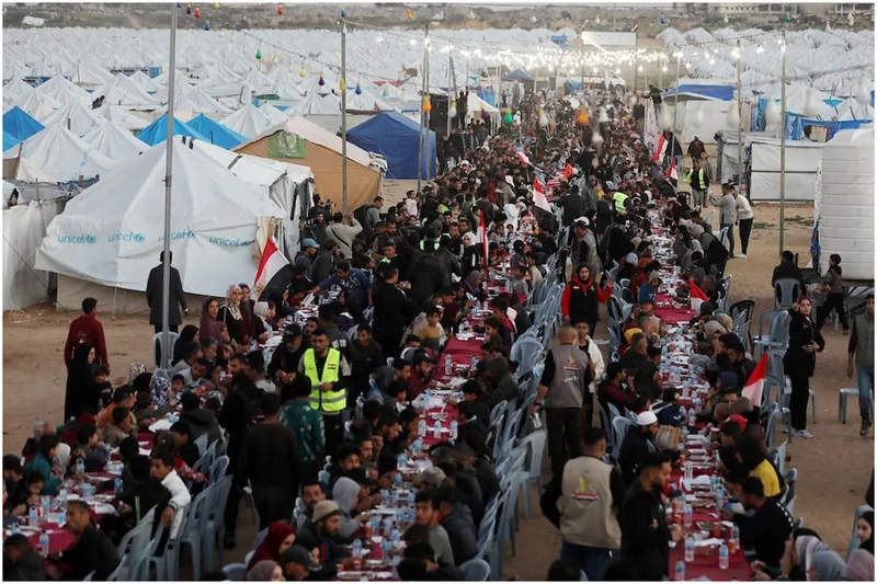 Gazze Şeridi’nin merkezinde yer alan El-Zahra kentinde, saldırılar nedeniyle evlerini terk etmek zorunda kalan siviller için toplu iftar programları organize ediliyor.