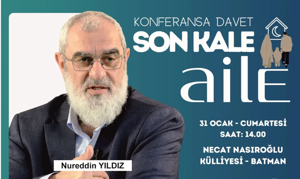 Batman Davet ve Kardeşlik Vakfı, modern çağın getirdiği sosyal ve kültürel zorluklar karşısında aile kurumunun önemine dikkat çekmek amacıyla “Son Kale: Aile” başlıklı bir konferans düzenliyor. Konferansa konuşmacı olarak ilahiyatçı-yazar Nureddin Yıldız katılacak.