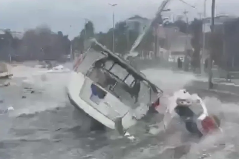 Hava Forum tarafından paylaşılan görüntülerde, şiddetli rüzgârın oluşturduğu dalgaların teknelere zarar verdiği ve bazı teknelerin alabora olduğu görüldü.