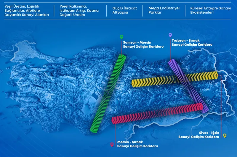 İlan edilen alanlarda kurulacak Mega Endüstri Bölgelerinin, mevcut Organize Sanayi Bölgelerinin ortalama 11 katı büyüklüğünde olacağı bildirildi. Yeni bölgelerin demiryolları ile limanlara bağlanacağı, çalışanlar için lojmanlar ile sanayi ve teknoloji kolejleri gibi sosyal donatı alanlarına sahip olacağı ifade edildi. Bakan Kacır, büyük ölçekli veri merkezi yatırımlarıyla dijital dönüşümün hızlanacağını, döngüsel ekonomi ve yeşil üretim anlayışının esas alınacağını kaydetti.