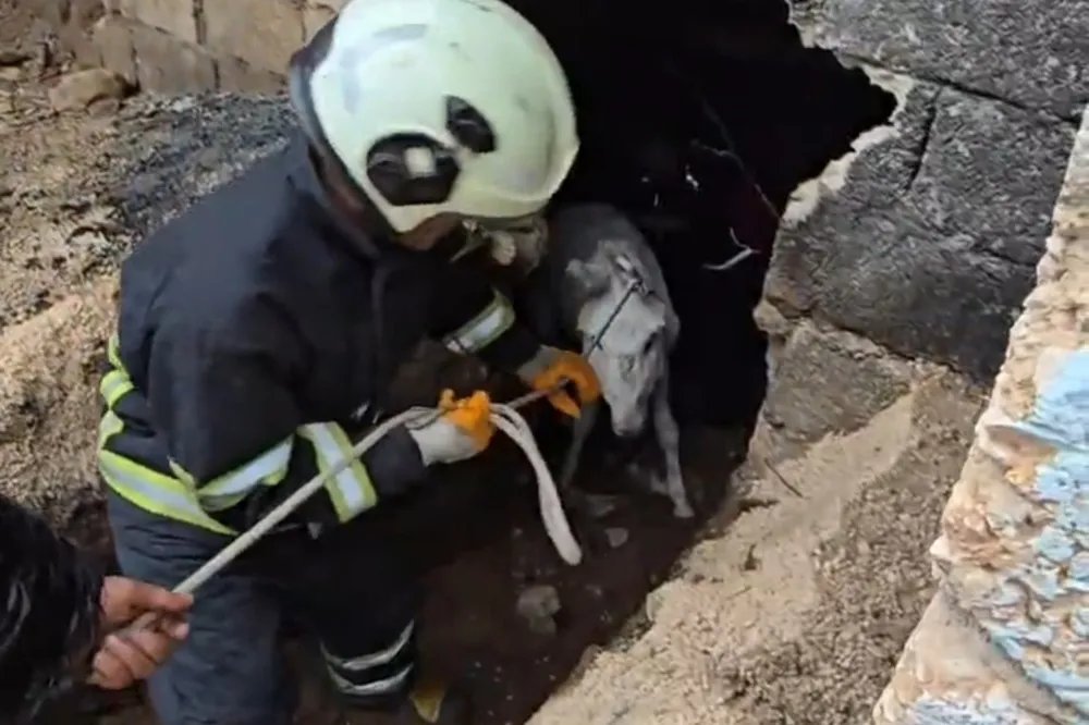 Mardin’de çöken ahıra düşen eşek itfaiye ekiplerince kurtarıldı