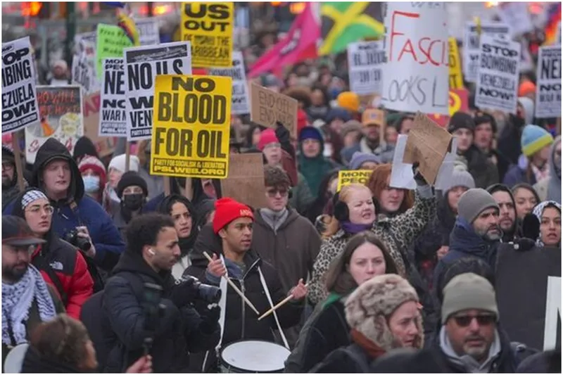 Göstericiler, Manhattan’da Times Meydanı’ndan Columbus Circle’a kadar yürüyüş yaparak ABD’nin Venezuela’ya yönelik müdahalesini protesto etti.