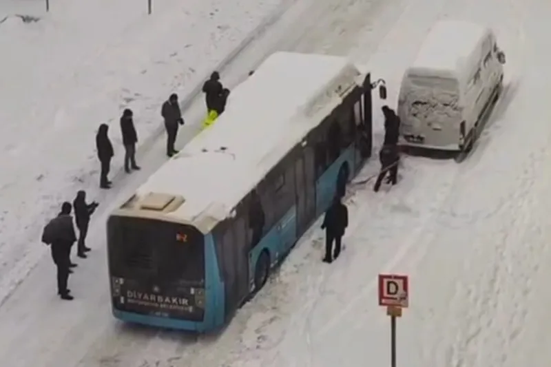 Diyarbakır'ın merkez Bağlar ilçesine bağlı Oğlaklı TOKİ konutlarına yolcu taşıyan Büyükşehir Belediyesine ait otobüs, kara saplandığı sokakta yolcular, çevreden tedarik ettiği kürekle müdahale etmek zorunda kaldı.