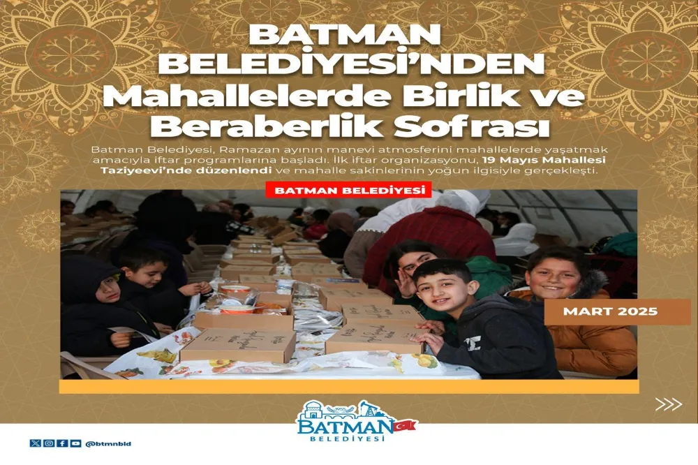Batman Belediyesi, Ramazan ayının manevi atmosferini mahallelerde yaşatmak amacıyla iftar programlarına başladı. İlk iftar organizasyonu, 19 Mayıs Mahallesi Taziyeevi’nde düzenlendi ve mahalle sakinlerinin yoğun ilgisiyle gerçekleşti.