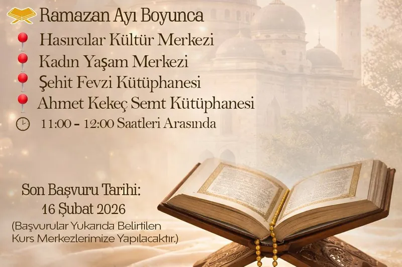 Ramazan ayı boyunca gerçekleştirilecek mukabele okumaları; Hasırcılar Kültür Merkezi, Gelinciktepe Kadın Yaşam Merkezi, Şehit Fevzi Kütüphanesi ve Ahmet Kekeç Semt Kütüphanesi’nde yapılacak.
