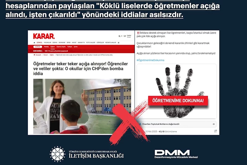 DMM'nin X hesabından yapılan paylaşımda, bazı basın yayın organların yer alan ve sosyal medya hesaplarından "Köklü liselerde öğretmenler açığa alındı, işten çıkarıldı" yönündeki iddialar yer aldığı hatırlatıldı.