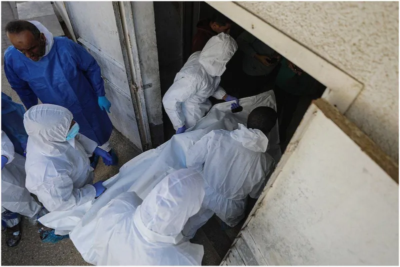 Gazze’deki El-Şifa Hastanesi’nde görev yapan adli tıp ve suç delilleri ekibi, işgal rejimi tarafından alıkonulduktan sonra teslim edilen şehitlerin cenazeleri üzerinde inceleme yürütüyor.
