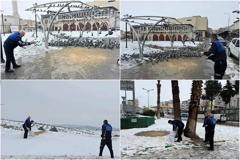 Gaziantep'te etkisini artıran kar yağışı, sokak hayvanları ve kuşların yem bulmada zorlanmasına neden olurken zabıta tarafından soğuk hava şartlarında yiyecek bulmakta zorlanan hayvanlar için doğaya yem bırakıldı.