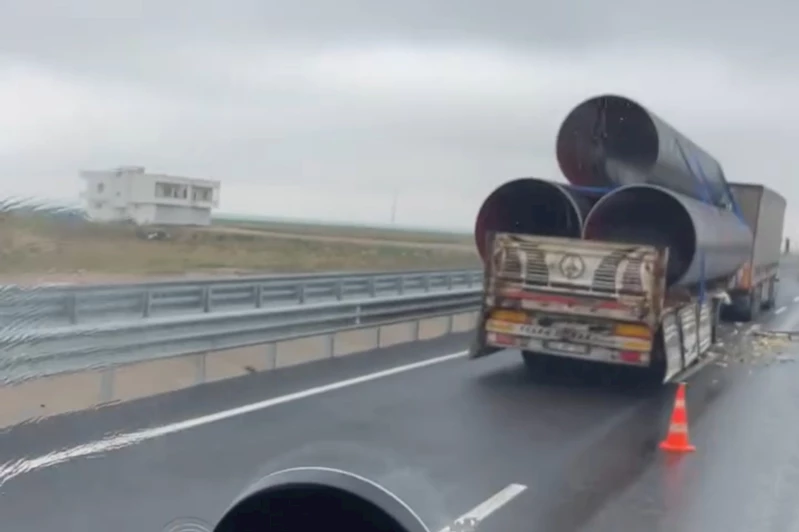 Sürücülerin ismi ve plakaları öğrenilmeyen demir boru yüklü tır, seyir halindeki başka bir tıra arkadan çarptı.