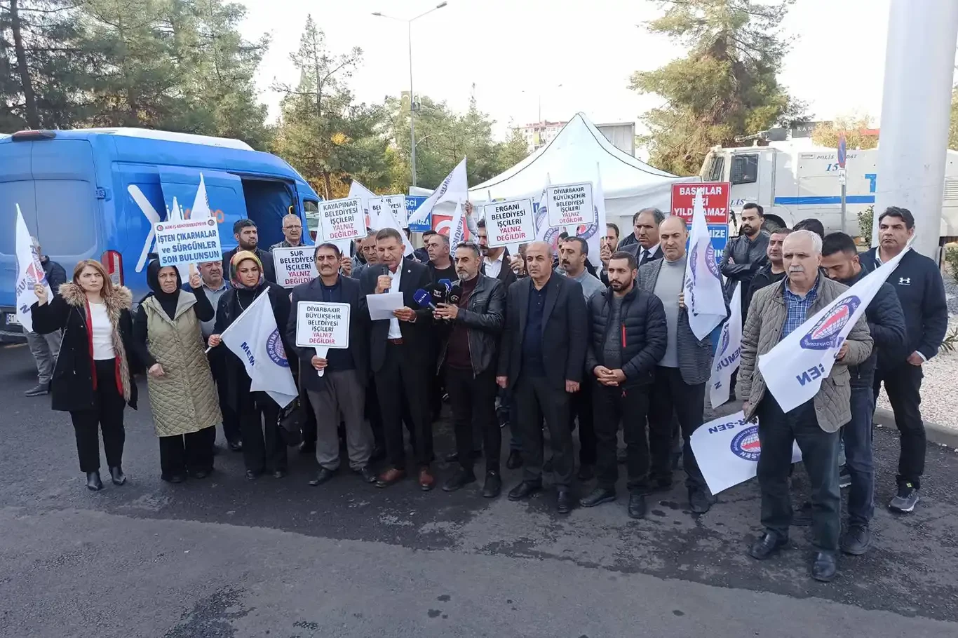 Diyarbakır Büyükşehir Belediyesi önünde işçilerin eylemine katılan Memur-Sen Diyarbakır İl Başkanı Tekdemir, "Bugün DEM’li Diyarbakır Büyükşehir Belediyesi yöneticileri tarafından ekmeği ile oynanan emekçi kardeşlerimize destek vermek, bu haksızlığa karşı emek dayanışmasını gerçekleştirmek üzere buradayız. Onurları, ekmekleri, haysiyetleri için direnen kardeşlerimizi en yüce direniş ruhuyla, emeği aziz bilen Genel Merkez Yönetim Kurulumuzun, teşkilatımızın ve bir milyonu aşan üyemizin dayanışma kararlılığıyla selamlıyorum." dedi.